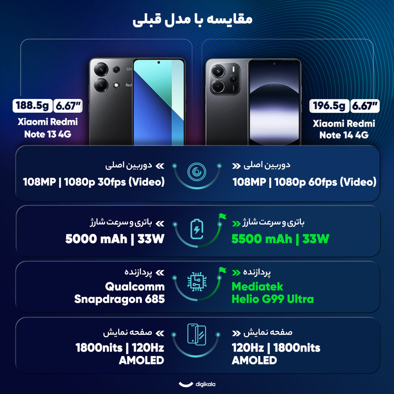 شیائومی Redmi Note 14 4G یکی از جدیدترین گوشیهای سری نوت شیائومی است که همواره از پرفروشترین سریهای شیائومی بودهاند. این موبایل که در ژانویه 2025 معرفی شد، با ابعاد 163.3x76.6x8.2 میلیمتر و وزن 196.5 گرم طراحیای زیبا و ارگونومیکی دارد. از طرفی با مقاومت در برابر پاشش آب و گرد و غبار و داشتن استاندارد IP54 در شرایط مختلف دوام و پایداری بیشتری ارائه میدهد. صفحه نمایش 6.67 اینچی AMOLED با نرخ بروزرسانی 120 هرتز و روشنایی 1800 نیت، نمایش تصاویری زنده و شفاف را تضمین میکند. فناوری Always-on Display تجربهای منحصربهفرد در مشاهده محتوا فراهم میکند. محافظ Corning Gorilla Glass 5 نیز صفحه نمایش را در برابر خط و خش محافظت میکند. پردازنده بهینه Mediatek Helio G99 Ultra با معماری 6 نانومتری، در کنار پردازنده گرافیکی Mali-G57 MC2، عملکردی روان و بینقص در اجرای اپلیکیشنها و بازیهای نیمه سنگین ارائه میدهد. باتری 5500 میلیآمپرساعتی با قابلیت شارژ سریع 33 وات نیز استفاده طولانی مدت و شارژ سریع را تضمین میکند. دوربین اصلی 108 مگاپیکسلی با لنز عریض و فناوری فوکوس PDAF، تصاویری شفاف و حرفهای ثبت میکند. دوربین ماکرو 2 مگاپیکسلی تجربهای جذاب برای عکاسی از جزئیات فراهم میکند. دوربین سلفی 20 مگاپیکسلی برای عکسهای شخصی و تماسهای تصویری بسیار مناسب است. در پایان، ردمی نوت 14 4G با سیستمعامل Android 14، بلوتوث 5.3، و حسگر اثرانگشت زیر صفحه نمایش، Redmi Note 14 4G مجموعهای از طراحی زیبا، عملکرد قدرتمند و امکانات متنوع را ارائه میدهد که نیازهای کاربران را بهخوبی برآورده خواهد کرد.