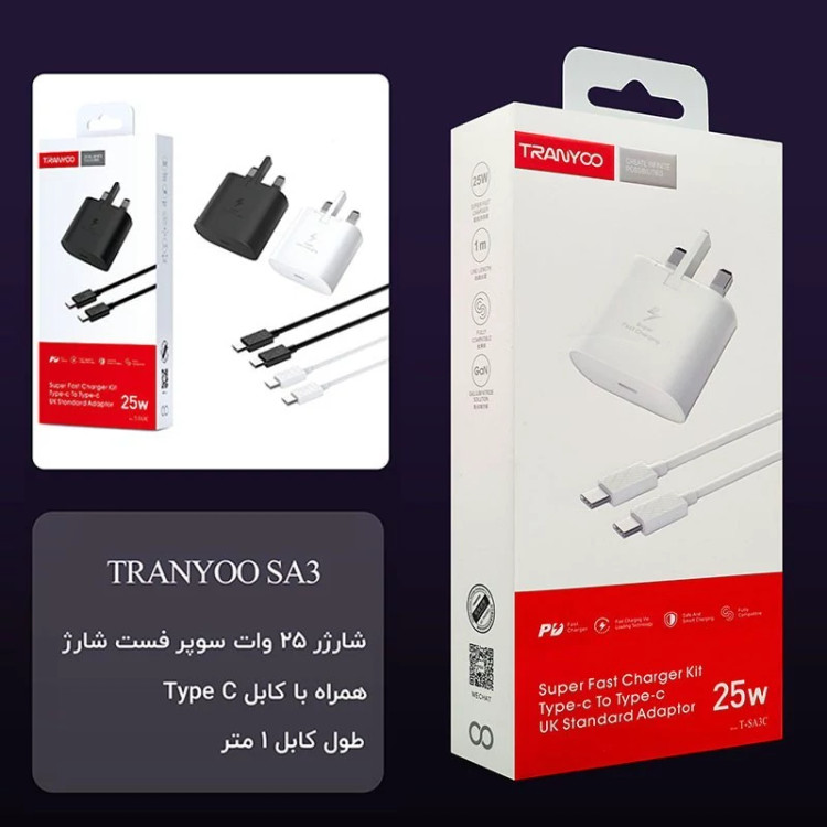 شارژر دیواری سوپر فست 25 وات ترانیو Tranyoo T-SA3C با کابل دوسر تایپ سی