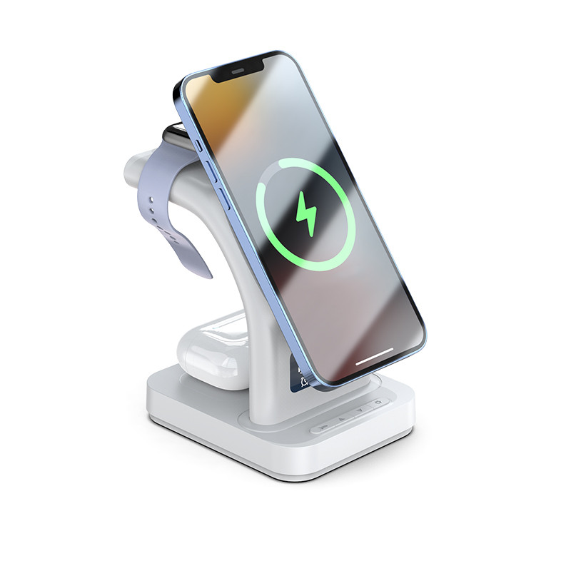 شارژر مگنتی بی سیم ۵ کاره توان خروجی شارژ : ۱۵w max دارای ساعت با قابلیت تنظیم آلارم دارای چراغ خواب شارژ گوشی ، ساعت هوشمند و ایرپاد